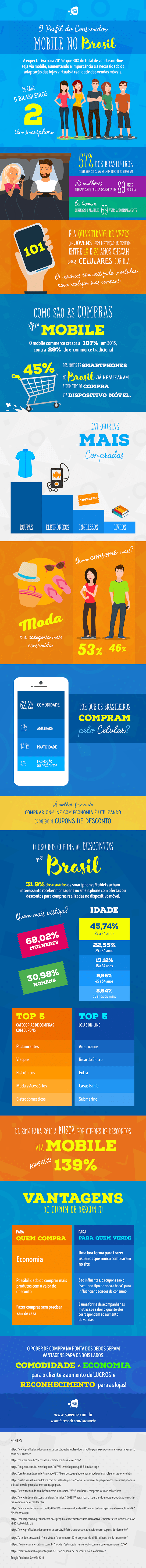 Pensando nisso, o SaveMe — um portal que reúne as melhores ofertas e cupons de lojas — elaborou um infográfico sobre o perfil do consumidor mobile no Brasil, onde apresenta as principais características do usuário on-line, informações sobre o uso dos cupons de desconto no país e dicas de economia para quem deseja ter vantagens na hora do pagamento. (Clique na imagem para ampliar)